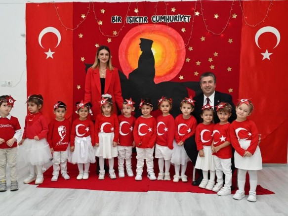 Minik öğrenciler, ellerinde Türk bayraklarıyla Cumhuriyet’e olan sevgilerini gösterirken, Başkan Güzel de çocuklarla birlikte marşlar söyledi ve etkinliklere katıldı.