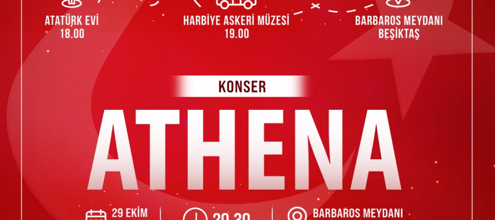 29 Ekim Cumhuriyet Bayramı kutlamaları, Cumhuriyet yürüyüşünün ardından saat 20.30’da Beşiktaş Barbaros Meydanı’nda gerçekleştirilecek Athena konseri ile devam edecek. Beşiktaş, Beyoğlu ve Şişli Belediye Başkanlarının da katılacağı konserde, Athena grubu en sevilen şarkılarını Cumhuriyet için seslendirecek.