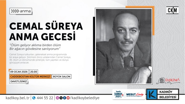 Türk şiirinin usta isimlerinden Cemal Süreya, Kadıköy Belediyesi Caddebostan Kültür Merkezi’nde şiir, tiyatro, müzik ve söyleşinin bir araya geldiği geceyle anılacak. Cemal Süreya’nın edebiyata, dile ve kültüre bıraktığı izlerin farklı disiplinler aracılığıyla yeniden yorumlanacağı programın sunuculuğunu Övünç Ezgi Yılmaz üstlenecek. Gecenin açılış konuşmasını yapacak olan Seyyit Nezir, Cemal Süreya’nın şiir dünyasını ve kuşağıyla kurduğu ilişkiyi ele alacak.