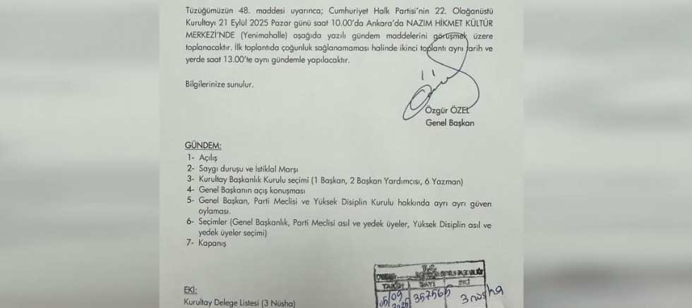 CHP'de İstanbul 45. Asliye Hukuk Mahkemesi'nin İstanbul İl Yönetimi'ni geçici olarak görevden almasının ardından 21 Eylül Pazar günü 22. Olağanüstü Kurultay toplanması kararı alındı. Genel Başkan Özgür Özel imzasıyla Çankaya 4. İlçe Seçim Kurulu'na bine yakın delegenin talebiyle yapılan başvuruya göre 22. Olağanüstü Kurultay Nazım Hikmet Kültür Merkezi'nde mevcut yönetime yönelik güven oylaması ve Genel Başkanlık ile Parti Meclisi seçimleri gündemiyle toplanacak.