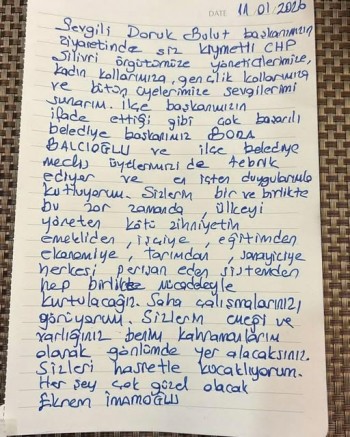 Ziyaret sırasında Ekrem İmamoğlu’nun Silivri halkına hitaben kaleme aldığı mektup da kamuoyuyla paylaşıldı. İmamoğlu mektubunda; birlik, dayanışma ve mücadele vurgusu yaparak, adalet, demokrasi ve eşitlik mücadelesinin kararlılıkla sürdürüleceğini ifade etti. CHP örgütüne ve Silivri halkına selamlarını ileten İmamoğlu, “Her şey çok güzel olacak” mesajıyla umut çağrısında bulundu.