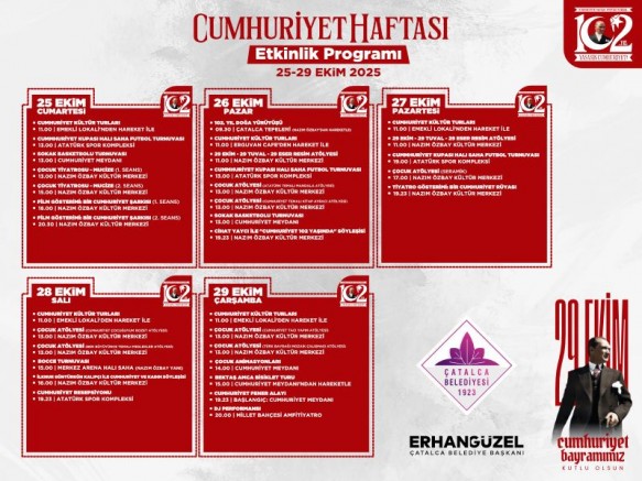 25–29 Ekim tarihleri arasında düzenleyeceğimiz Cumhuriyet Haftası etkinliklerine, büyük Çatalca ailemizi davet ediyoruz.