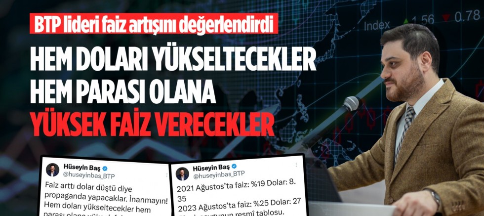 BTP Genel Başkanı Hüseyin Baş, “Faiz arttı dolar düştü diye propaganda yapacaklar. İnanmayın! Hem doları yükseltecekler, hem parası olana yüksek faiz verecekler” dedi.