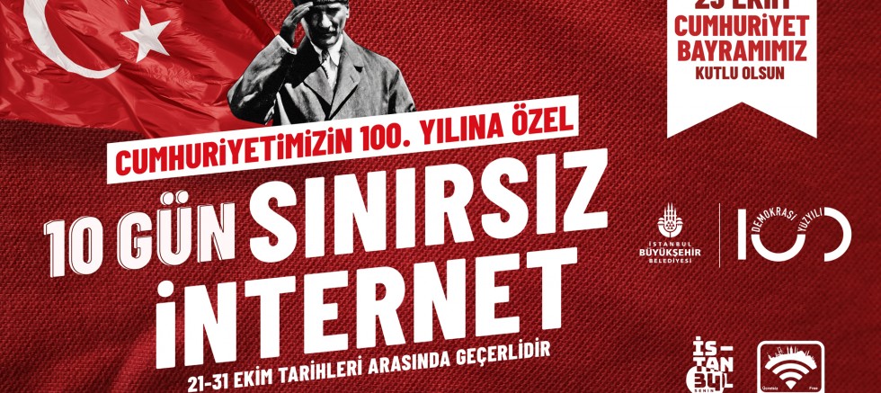İstanbul Büyükşehir Belediyesi (İBB) Bilgi İşlem Daire Başkanlığı ve İBB iştiraki İSTTELKOM tarafından sunulan ücretsiz wi-fi uygulaması, Cumhuriyetimizin 100. Yılı için 10 gün boyunca sınırsız kullanılabilecek. Aylık 60 GB sınırı olan İBB Wi-Fi ücretsiz, özgür ve güvenli internet hizmeti, Cumhuriyet Bayramına özel, 21-31 Ekim tarihleri arasında sınırsız olacak.