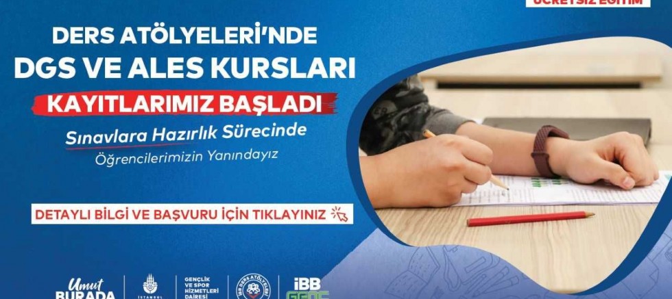 İstanbul Büyükşehir Belediyesi’nin sınavlara hazırlanan gençlere destek olmak amacıyla hayata geçirdiği Ders Atölyeleri’nde üniversite öğrencileri ve mezunları için Akademik Personel ve Lisansüstü Eğitimi Giriş Sınavı (ALES) ve Dikey Geçiş Sınavı (DGS) hazırlık kursları başlıyor. Türkçe, sözel mantık, matematik ve sayısal mantık derslerinden oluşan program, sınavlara hazırlanan öğrencilere kapsamlı ve sürdürülebilir bir eğitim sunmayı hedefliyor. Dört farklı noktada gerçekleştirilecek olan kurslar için başvurular İBB Ders Atölyelerinin https://