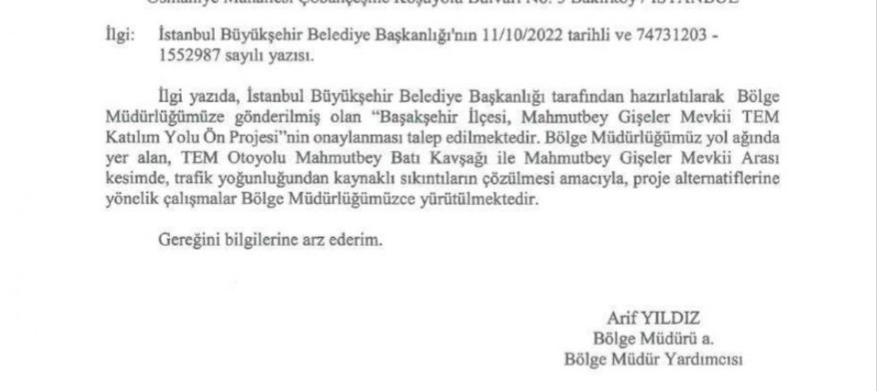 KGM 1. Bölge Müdürlüğü tarafından Bölge Müdür Yardımcısı Arif Yıldız imzasıyla İBB’ye gönderilen yazıda, “İBB tarafından hatırlatılarak bölge müdürlüğümüze gönderilmiş olan Başakşehir İlçesi Mahmutbey Gişeler Mevkii TEM Katılım Yolu Ön Projesi’nin onaylanması talep edilmektedir. Bölge müdürlüğümüzün yol ağında yer alan TEM otoyolu Mahmutbey Batı kavşağı ile Mahmutbey Gişeler arası kesimde, trafik yoğunluğundan kaynaklı sıkıntıların çözülmesi amacıyla proje alternatiflerine yönelik çalışmalar, bölge müdürlüğümüzde yürütülmektedir” denildi.
