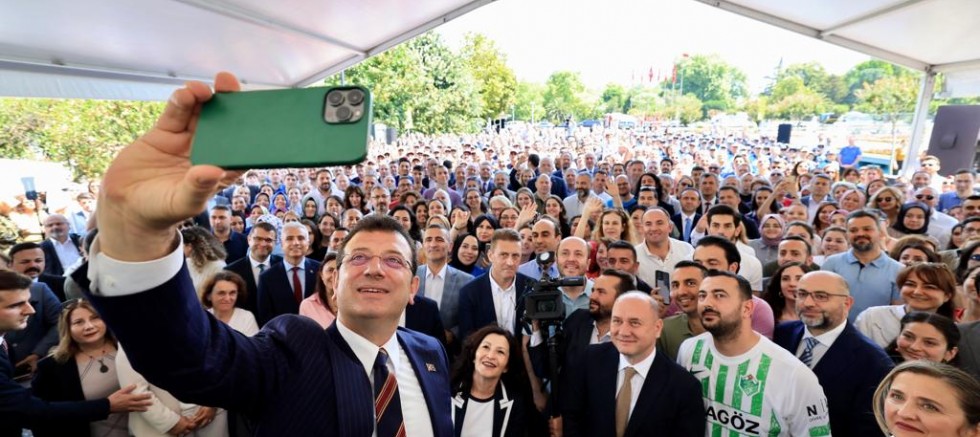 İmamoğlu, konuşmasının ardından mesai arkadaşlarıyla toplu özçekim yaptı.