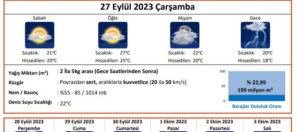 Bulutlu bir gökyüzü ve rüzgarın kuzeyli yönlerden (Poyraz) aralıklarla fırtına şeklinde (20-50km/s) esmesi beklenirken, rüzgârlar nedeniyle yarından itibaren sıcaklıkların 23-25°C aralığında mevsim normalleri civarı ve altında seyredeceği tahmin ediliyor.