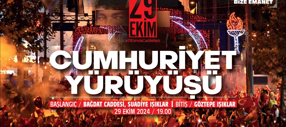 29 Ekim Cumhuriyet Bayramı kutlamalarının doruk noktasını ise bu yıl da “Cumhuriyet Yürüyüşü” oluşturuyor. Bağdat Caddesi Suadiye ışıklarda saat 19.00’da başlayacak yürüyüş, Göztepe ışıklarda son bulacak. Türk bayrakları ve ışıklı led ekranlarla özel olarak hazırlanan Cumhuriyet tırı ve kortejin geçişi, caddenin farklı noktalarına kurulan dev ekranlardan da canlı olarak izlenebilecek. Yürüyüşe, Cumhuriyet sevdalıları ellerinde Türk bayrakları, Atatürk posterleri ve meşalelerle katılarak renkli görüntüler oluşturacak.