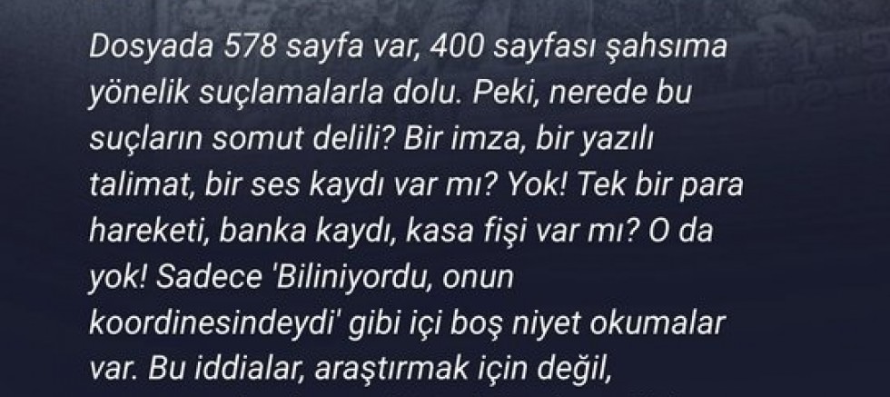 Akpolat’ın açıklamasında, iddianamede yüzlerce sayfa suçlama bulunmasına rağmen tek bir somut delil, imza veya banka kaydının yer almadığına dikkat çekildi. Bu durum, davanın siyasi bir kumpas niteliği taşıdığına dair kamuoyunda güçlü bir kanaat oluşturuyor.
