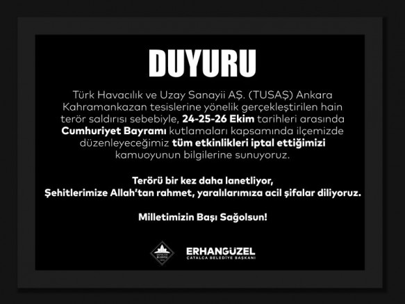 Türk Havacılık ve Uzay Sanayii AŞ. (TUSAŞ) Ankara Kahramankazan tesislerine yönelik gerçekleştirilen hain terör saldırısı nedeniyle, 24-25-26 Ekim tarihlerinde Cumhuriyet Bayramı kutlamaları kapsamında ilçemizde düzenleyeceğimiz tüm etkinlikler iptal edilmiştir.