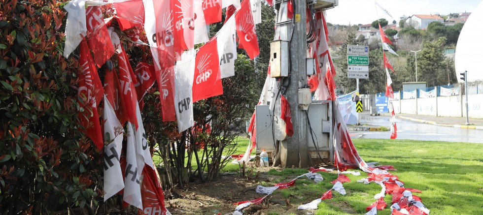 Sarıyer’de , CHP Sarıyer Belediye Başkan Adayı Mustafa Oktay Aksu ve İmamoğlu afişlerini kesici aletlerle saldıranlar çirkin saldırıyı bu kez CHP bayraklarına yaptı
