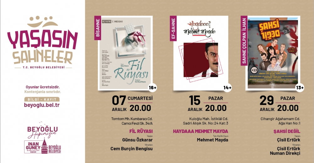 Bu projeyle Beyoğlu’nda perde açan özel tiyatroların daha geniş kitlelerle buluşmasına katkı sunan Beyoğlu Belediyesi, sanatseverlerin tiyatro oyunlarına erişimini de desteklemeyi amaçlıyor.